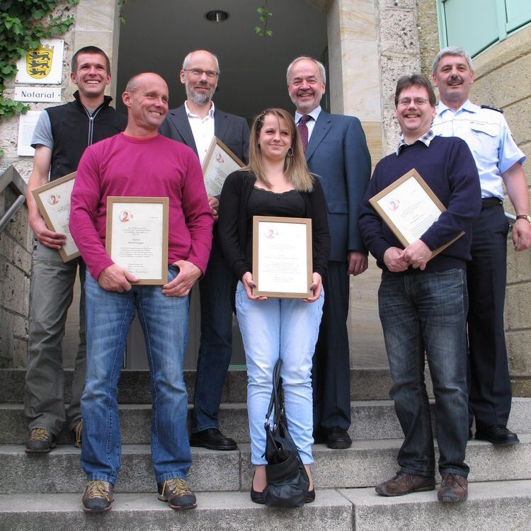 Vorsitzender Landrat Thomas Reumann und sein Stellvertreter, der leitende Polizeidirektor Franz Lutz (beide hinten rechts) zeichneten Jörg Greiner, Bernd Geiger, Dr. Volker Staniek, Jennifer Maier (stellvertretend für ihre Mutter Serap Trissler-Reutter) und Wolfgang Prinz (von links) für besondere Zivilcourage aus.