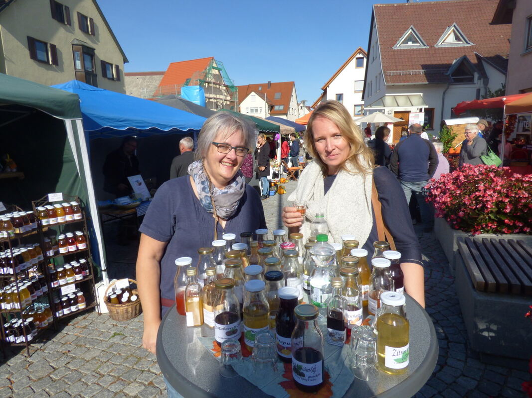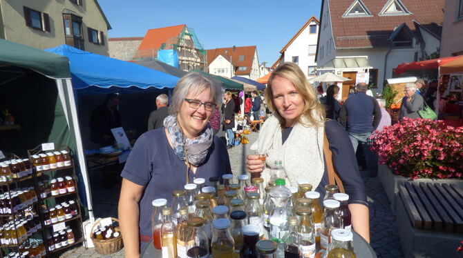32 Sirups hatte Ulrike Frick (links) im Angebot. Die Marktbesucher probierten sich munter durch die bunte Palette. FOTO: BÖRNER