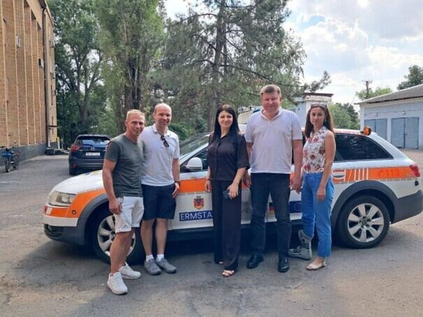 Simon Nowotni (links) und Martin Salzer mit Bürgermeister Serhii Parpulanskyi. Links seine Assistentin Nataliia Kusturova, rechts Übersetzerin Natalia Petrenko.