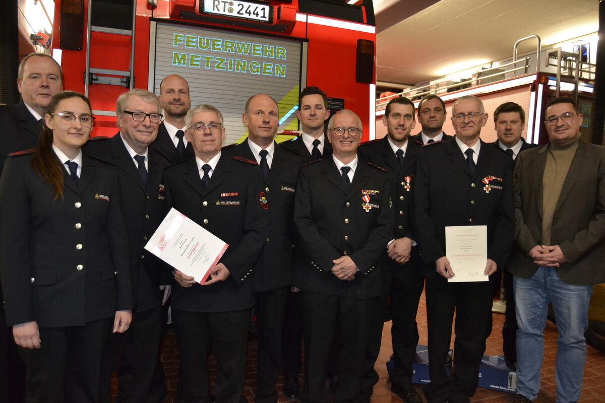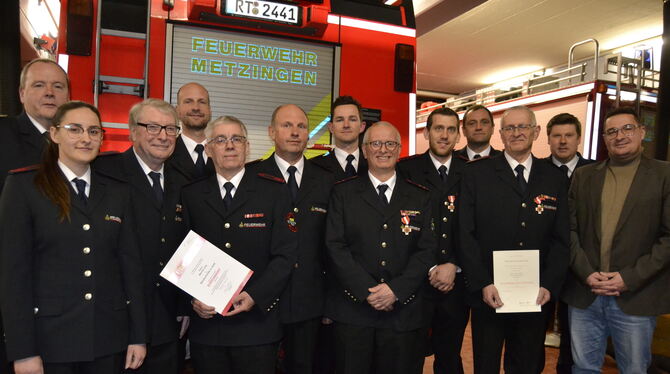 Hauptversammlung der Feuerwehr Metzingen und Neuhausen. Im Bild: die geehrten Feuerwehrleute zwischen Kommandant Hartmut Holder (links) und Erstem Bürgermeister und damit Feuerwehr-Dezernent Patrick Hubertz (rechts).