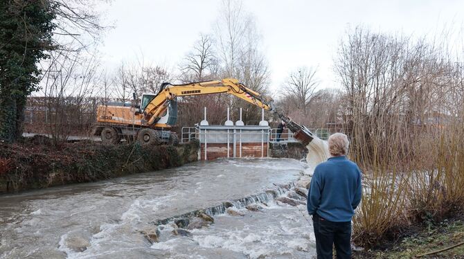 METZINGEN. Das große Hochwasser blieb aus, aber die Metzinger Feuerwehr hatte unter anderem einen Einsatz am Ermswehr neben dem Freibad. Zum Beseitigen der Äste und Baumstämme vor dem Wehr wurde ein Bagger eingesetzt und später der kleine Kanal Richtung Stadt dicht gemacht.