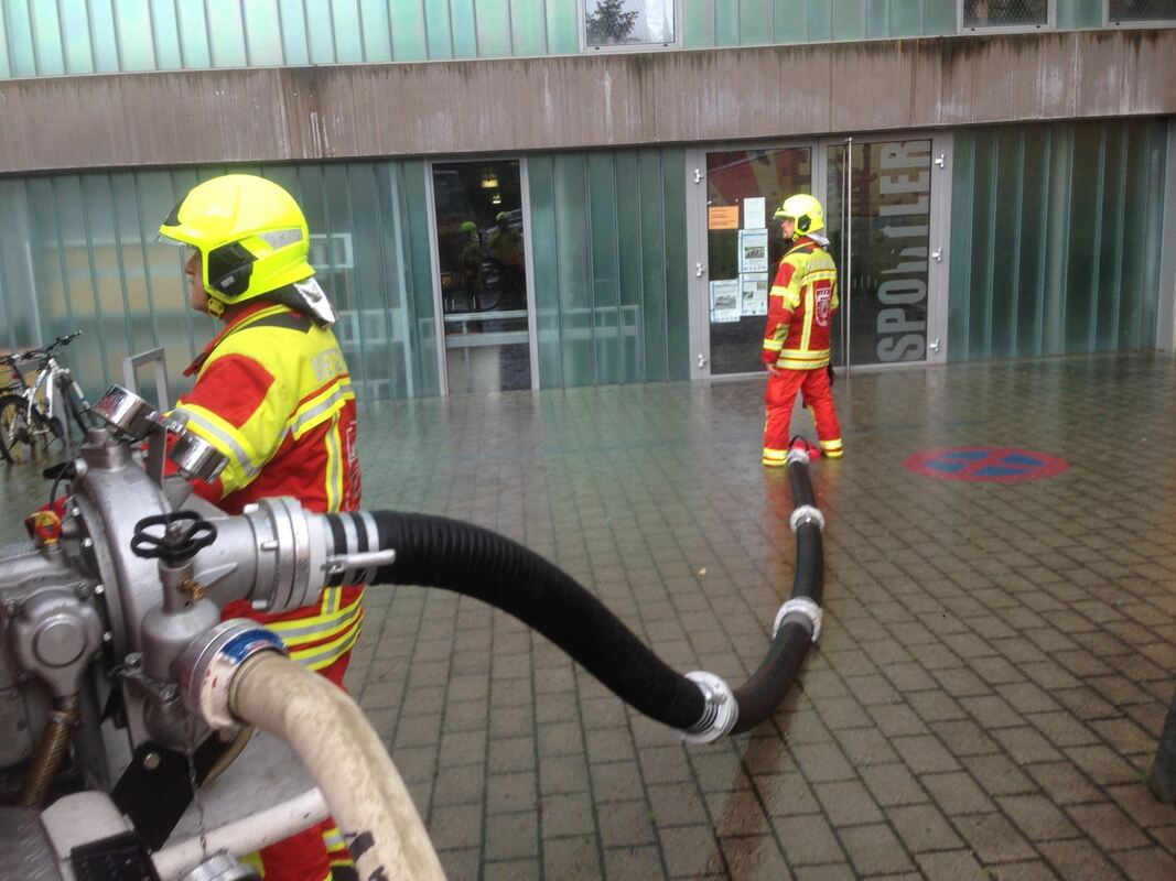 Die Öschhalle ist bei Starkregen ein »kritisches Objekt«, stand schon öfter unter Wasser. Deshalb erarbeiten Stadt, Feuerwehr und Bauhof besondere Schutzmaßnahmen für sie. Im Bild pumpt die Metzinger Feuerwehr im Juni 2018 Wasser aus der Halle.