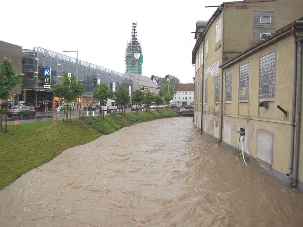 Die Kernstadt Metzingen kam beim Hochwasser Anfang Juni 2013 vergleichsweise glimpflich davon. Dazu beigetragen haben Abflachungen am Erms-Ufer, wie hier bei der Seifenfabrik Bazlen, die den Fluss gebremst haben. ARCHIVFOTO: PFISTERER