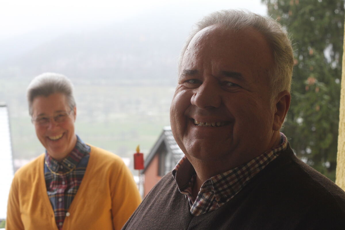 Zwei, die seit 35 Jahren zusammengehören wie Pech und Schwefel: Winfried und Sabine Wagner, hier auf der Terrasse ihres Hauses in der Dettinger Buchhalde. Der 69-Jährige zieht sich nach 40 Jahren als Humorist auf der Bühne zurück. Wenn es eine Fortsetzung von »Laible und Frisch« gibt, macht er als Bäcker Walter Laible natürlich weiter. FOTO: FINK