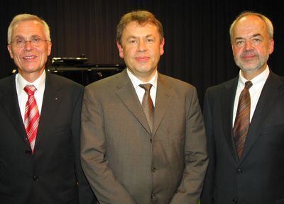 Dr. Joachim Weber (Mitte) ist der neue Chefarzt der Inneren an der Ermstalklink Bad Urach. Er folgt Dr. Michael Schmelz (links) nach. Rechts Landrat Thomas Reumann.