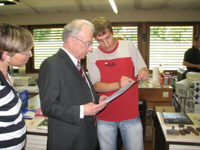 Baden-Württembergs früherer Ministerpräsident Lothar Späth lässt sich von Praktikant Kevin Hofer erklären, wie gedruckt wird.