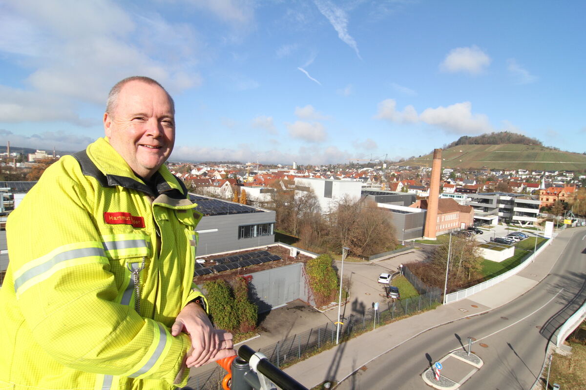 Über den Dächern Metzingen: Feuerwehrkommandant Hartmut Holder im Drehleiterkorb.