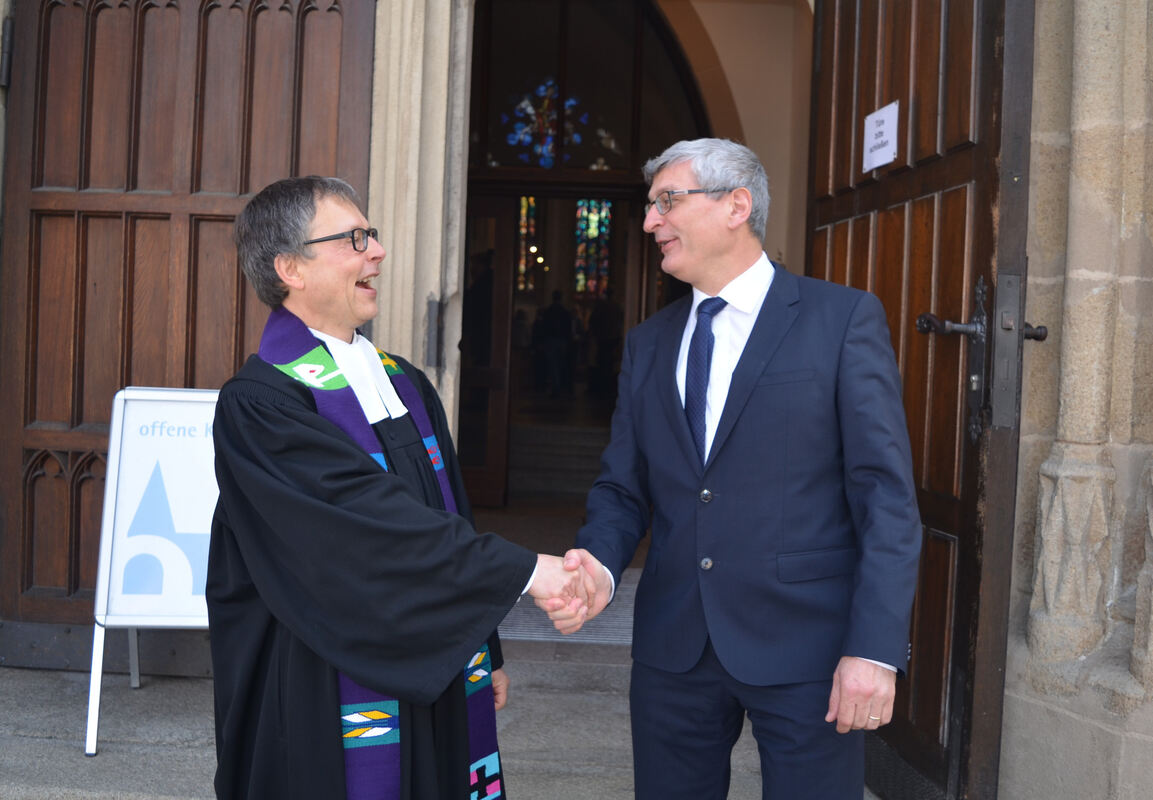Ein fester Händedruck zum Abschied: Pfarrer Martin Winkler (links), der am Sonntag seinen letzten Gottesdienst in Metzingen gehalten hat, und Pfarrer Albrecht Schäfer, der mit seinem Team die Vakanz überbrücken muss, bis die Stelle neu besetzt wird. FOTO: SANDER