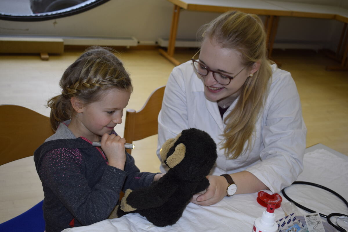 Emma hat ihren verletzten Affen Charly zur Teddy-Klinik-Ärztin Franziska Ott gebracht. Dort wird ihr Kuscheltier untersucht und behandelt.