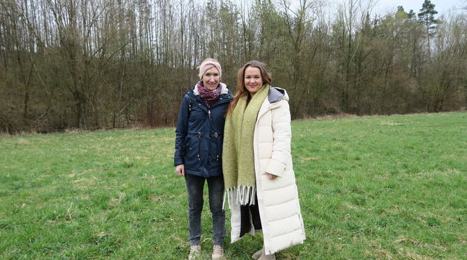 Antje Oswald (links) und Teresa Mavridis haben den Verein Die Ameisen − Naturkindergarten Pliezhausen gegründet. Anfang April zeigen sie das Grundstück, auf dem bald Kinder spielen und ein Wagen als Wetterschutz stehen soll.