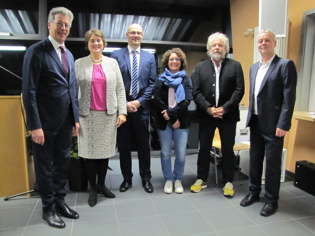 Nach den Corona-Jahren gab es erstmals wieder einen Neujahrsempfang des Walddorfhäslacher Gewerbevereins im Foyer der Ballspielhalle. Den Impulsvortrag hielt der Hohensteiner Unternehmer Johannes Schwörer, Geschäftsführer der Schwörer Haus KG (links). Auf dem Bild zu sehen sind außerdem Bürgermeisterin Silke Höflinger, Michael Necker, Vorsitzender des Gewerbevereins, Pamela Wetter und Ralf-Michael Röcker von der Gustav-Werner-Gemeinschaftsschule sowie Neckers Stellvertreter Jochen Tribusser. FOTO: MÜLLER
