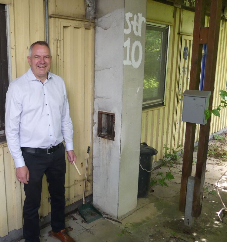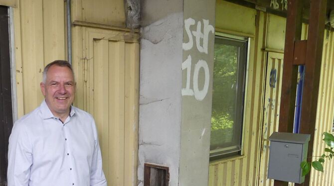 Bürgermeister Volker Brodbeck am maroden Container im Auchtert, der entfernt wird um neue Containerunterkünfte für Geflüchtete aufzustellen. FOTO: SANDER