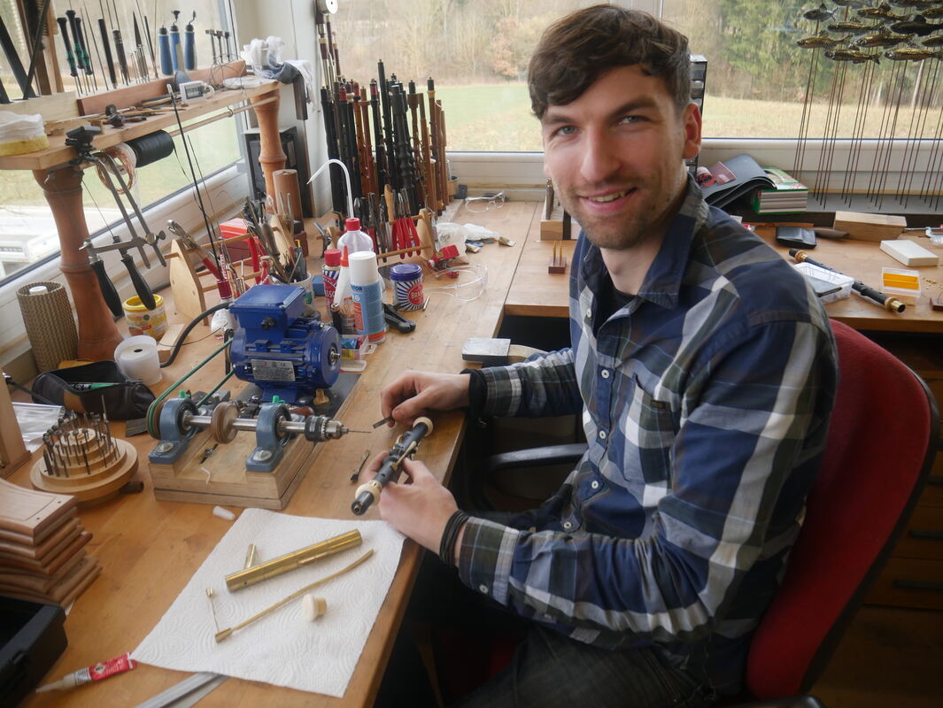 Hendrik Morgenbrodt ist in seiner Werkstatt gerade dabei, die Pfeifen für einen neuen Dudelsack zu fertigen.Foto: Morawitzki