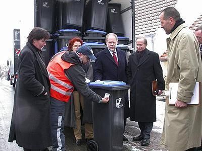 Auslieferung der Papiertonnen in Grafenberg mit Bürgermeister Holger Dembek, Friedrich Melchinger und Thomas Leichtle.