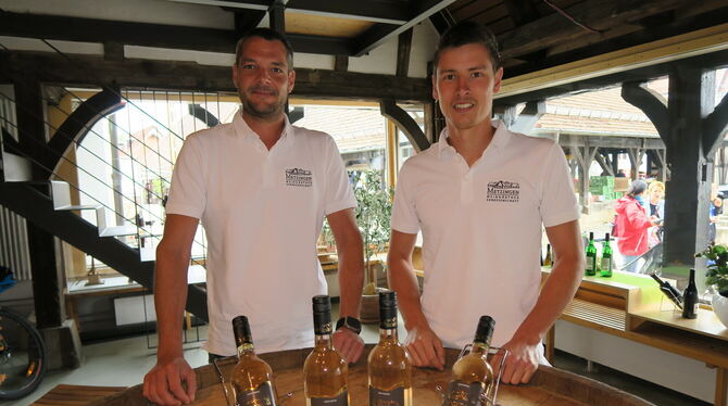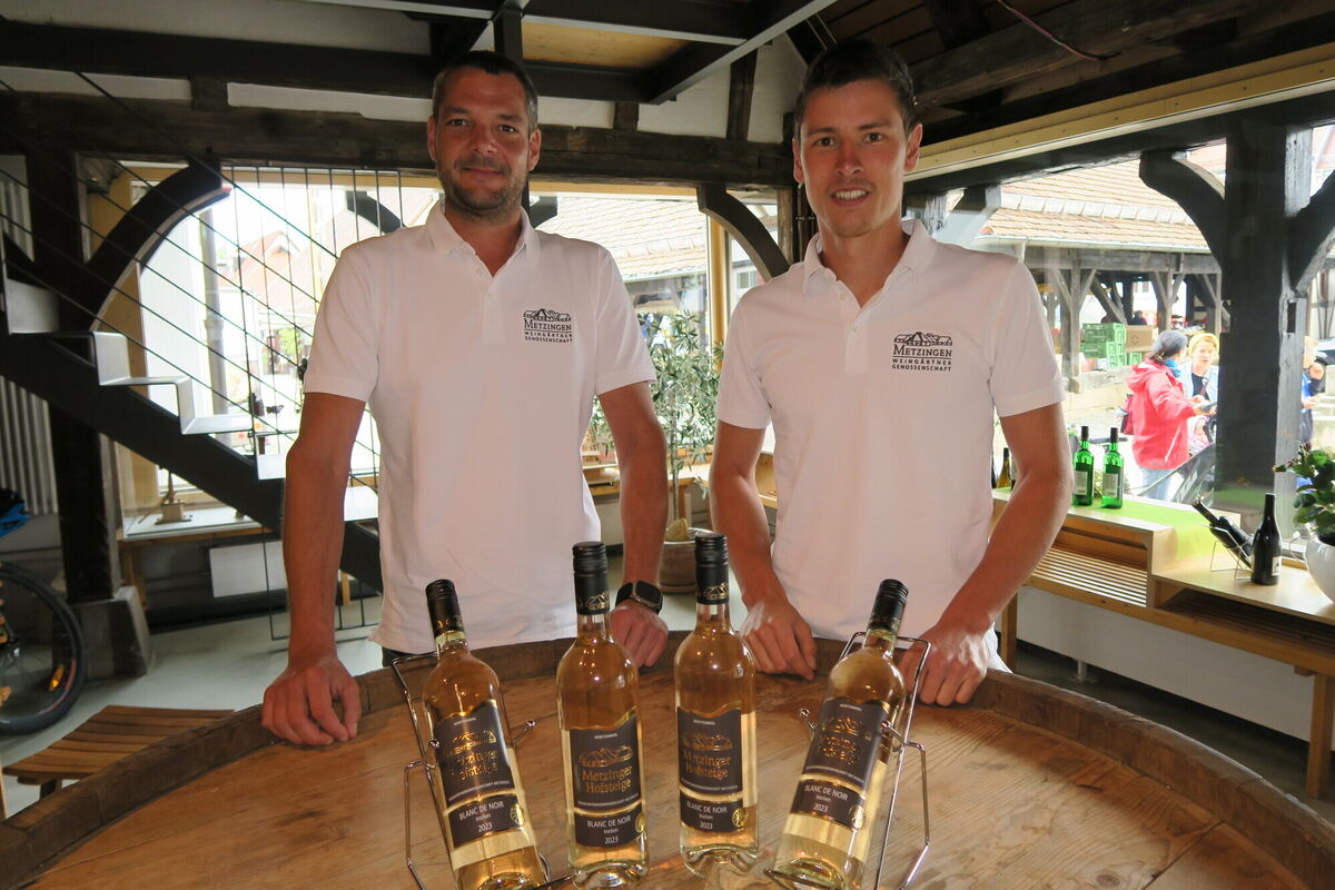 Robert Bahnmüller (links) und Christian Koch präsentieren den neuen Wein der Genossenschaft. Es ist ein Spätburgunder Blanc de Noir.