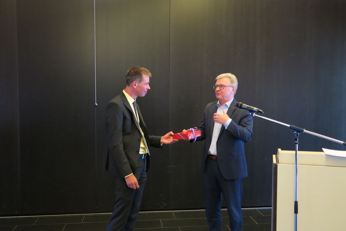 Bad Urachs Bürgermeister Elmar Rebmann (rechts) gratuliert Dr. Johannes Ady, dem neuen Direktor des Amtsgerichts Bad Urach, zu seinem neuen Amt.