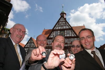 Lothar Schmidt (Euromint), Gerhard Stooß (Volksbank), Kurdirektor Wolfgang Schütz, Eckart Schweizer (Kreissparkasse) und Bürgermeister Markus Ewald präsentieren die funkelnagelneue Münze, auf der das Rathaus der Kurstadt abgebildet ist.