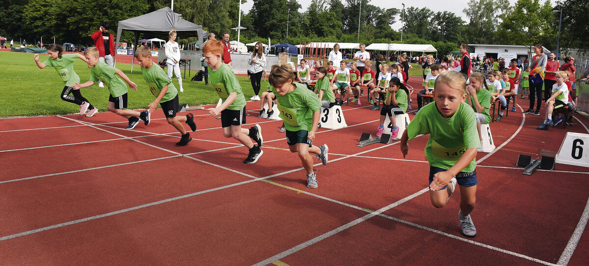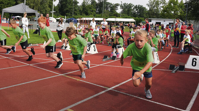 Startschuss frei für einen 50-Meter-Lauf mit Mädchen und Jungen beim Kreisfinale von »Jugend trainiert für Olympia« im Pliezhäuser Schönbuchstadion.
