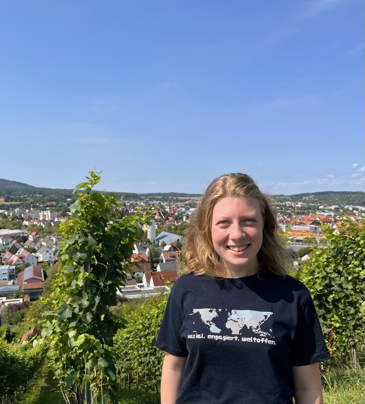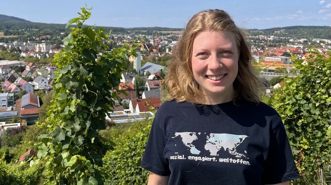 Ella Herzig, die im September ihr FSJ am »Camino« in Spanien beginnt, im Metzinger Weinberg. Im Hintergrund die katholische Bonifatius-Kirche. FOTO: SANDER