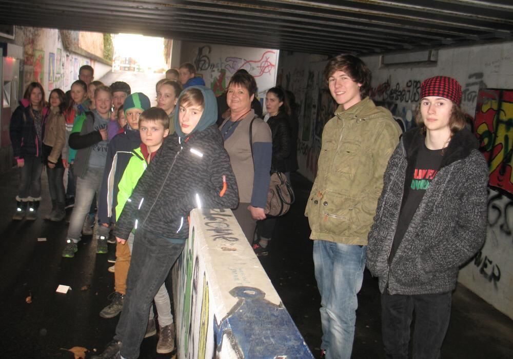 Sie wollen die Fußgängerunterführung am Bahnhof von Wannweil neu gestalten: Die Profi-Sprayer Semjon und Samuel Bär (von rechts) mit den Nachwuchs-Künstlern vor Ort. In der Mitte Bürgermeisterin Anette Rösch. Sie hat das Projekt mit angestoßen. FOTO: RITTGEROTH