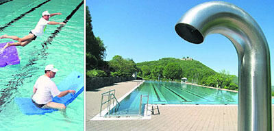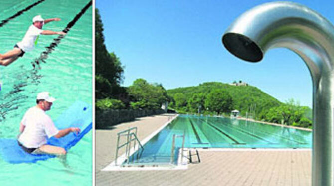 Bei einer Wasser-Temperatur in Höhe von 23 Grad lässt es sich aushalten: Dettingens Bürgermeister Michael Hillert (vorne) und Bauamtsleiter Klaus Brodbeck haben gestern im Dettinger Freibad schon 'mal Rutsche und Sprungturm getestet, während im Bad Uracher Höhenfreibad (rechts) noch bis Sonntag Ruhe herrscht.