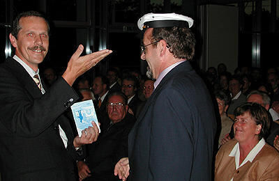 »Wie ein von der Besatzung gewählter Kapitän«: Bürgermeister-Stellvertreter Gustav Breitling (links) schenkte dem neuen Schultes gleich die passende Kopfbedeckung. Auch Dietmar Edelmanns Frau Marliese (ganz rechts) zeigte sich amüsiert.