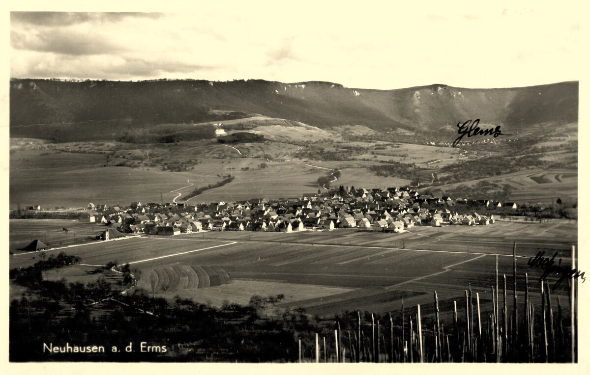 METZINGEN. Der Blick des auf dem Weinberg stehenden Betrachters geht über das Ermstal bis zum Albtrauf. In der Bildmitte der um 1930 entstandenen Postkarte liegt Neuhausen, damals ein Ort mit 2 000 Einwohnern. Gut zu erkennen sind links die Mittlere und die Innere Kelter sowie das Gasthaus zum Rebstock. Bemerkenswert sind auch die großen Feldfluren, von denen Neuhausen damals umgeben war. Diese sind heute weitgehend überbaut, so die Gewanne Amtäcker-Brühl im Vordergrund oder Hinter der Kirche und Oberer Auchtert hinter dem Ortskern.