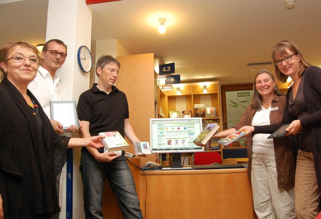 Die Bibliotheks-Beschäftigten (von rechts) Sabine Makram, Eva Eckstein, Armin Groß und Hedwig Haiber-Althaus (ganz links) sowie VHS-EDV-Experte Joachim Leutemann (Zweiter von links) weisen mit »alten« Medien den Weg zu den neuen.