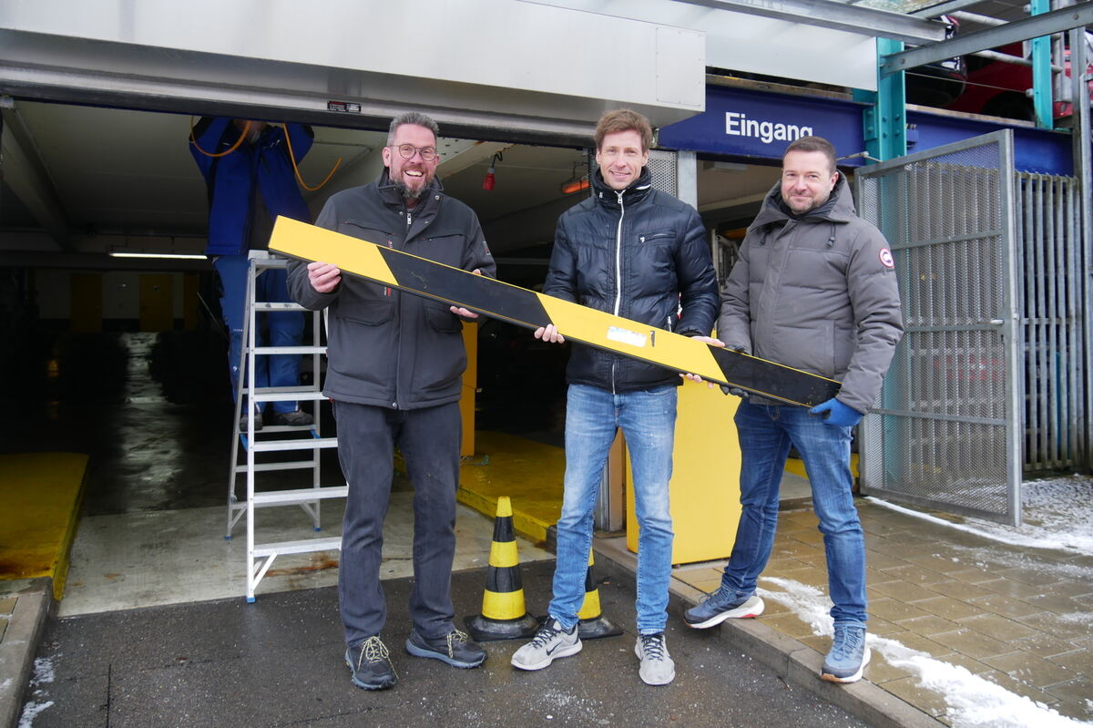 Die Zeit der Schranken ist jetzt auch im Uracher Parkhaus vorbei. Am Montag wurde sie abgeschraubt. Im Bild (von links) Niels Belschner (Technischer Leiter von Park Service Hüfner), Jan Heidemann (stellvertretender kaufmännischer Leiter der Stadtwerke Bad Urach) und Michael Gamisch (Objektleiter Park Service Hüfner).