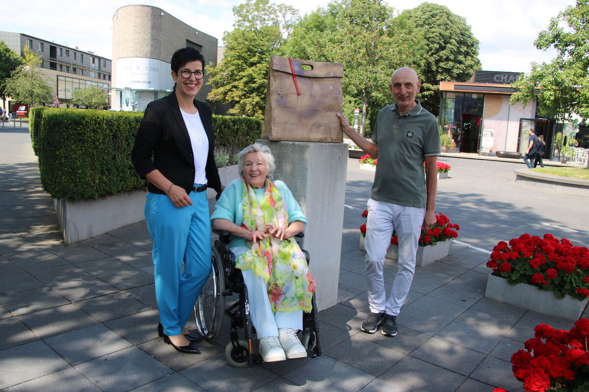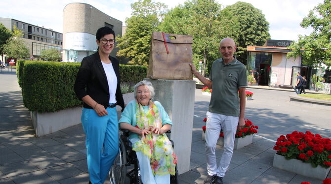 Eberhard Benz und Kathrin Bindemann haben die Hugo Boss-Einkaufstasche aus Keramik offiziell an die Stadt Metzingen übergeben, was Oberbürgermeisterin Carmen Haberstroh sehr freut.