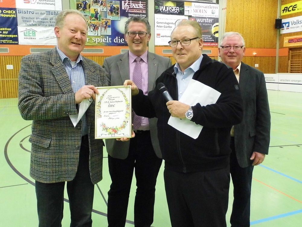 Joachim Riethmüller (links) erhält die Spendenurkunde von Erwin Schlichter (Zweiter von rechts). Im Hintergrund Michael Donth; rechts Konrad Hölz, der die gute Sache ebenfalls unterstützt. FOTO: TBÖ