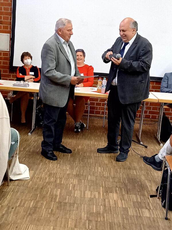Helmut Bösch (links) wird von Dekan Michael Karwounopoulos mit der Brenz-Medaille geehrt. FOTO: KIRCHE
