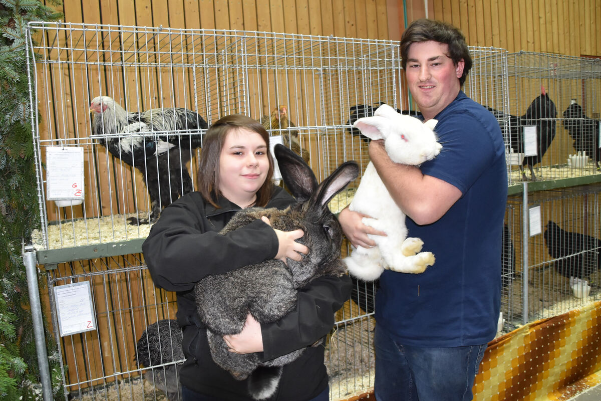 Kleintierzuchtausstellung Riederich: Jasmin Stiefel und Patrick Armbruster mit den beiden Deutschen Riesen der Züchterin. FOTO: SANDER