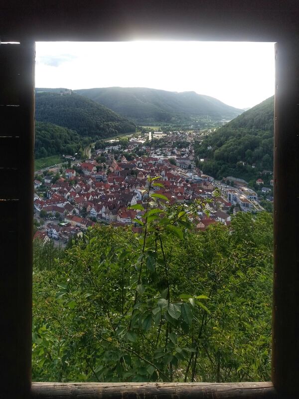Der Blick durch das Fenster des Michelskäppeles zeigt Bad Urach von seiner schönsten Seite.