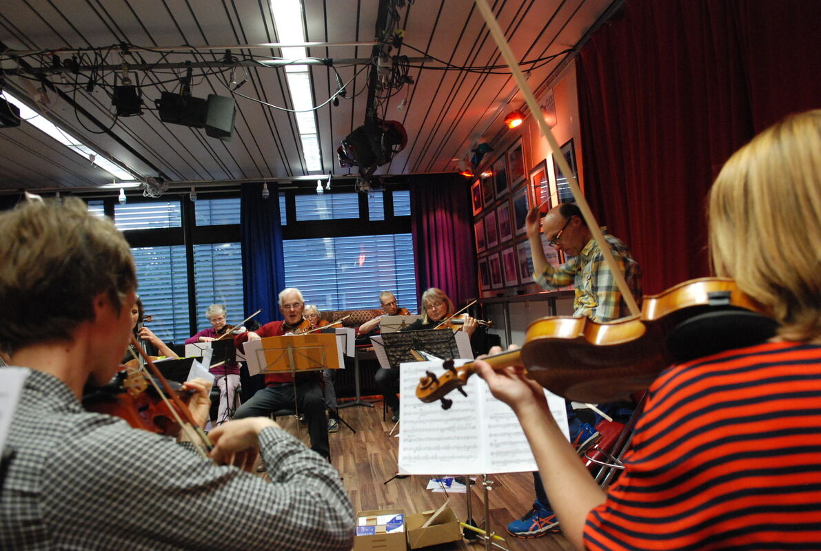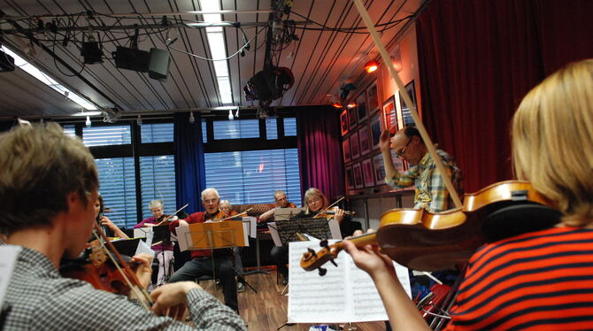 Mit Elan: Das Kammerorchester Metzingen probt unter seinem Stammdirigenten Oliver Bensch in der Medienakademie. FOTO: PFISTERER