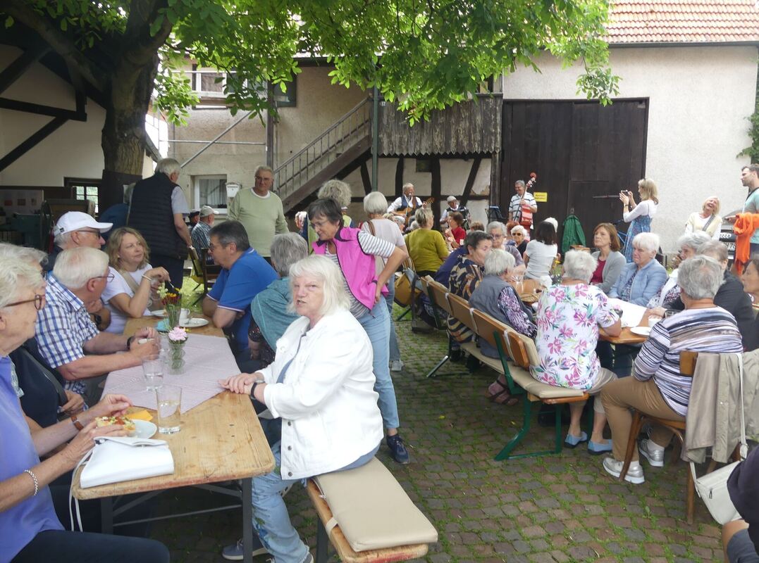 Das historische Ambiente im Entenhof beim Kaffeetrinken unter dem alten Nussbaum mit Hintergrundmusik ist kennzeichnend für das Sommerfest vom Arbeitskreis Dorfmuseum. FOTO: SANDER