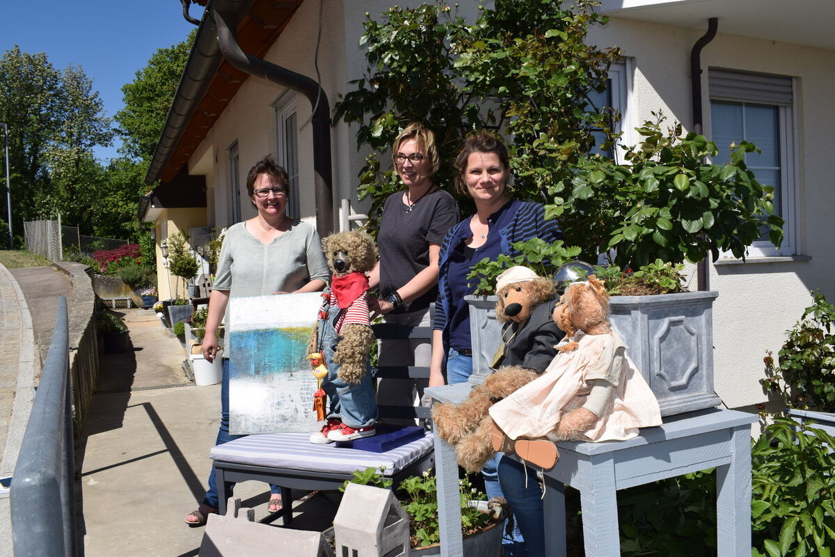 Grafenbergs Bürgermeisterin Anette Bauer, Künstlerin Tanja Kleeman und Rathausmitarbeiterin Stefanie Maisch (von rechts) haben vorab schon mal etwas dekoriert. So, oder so ähnlich könnte es am Sonntag überall im Ort aussehen. FOTO: RITTGEROTH