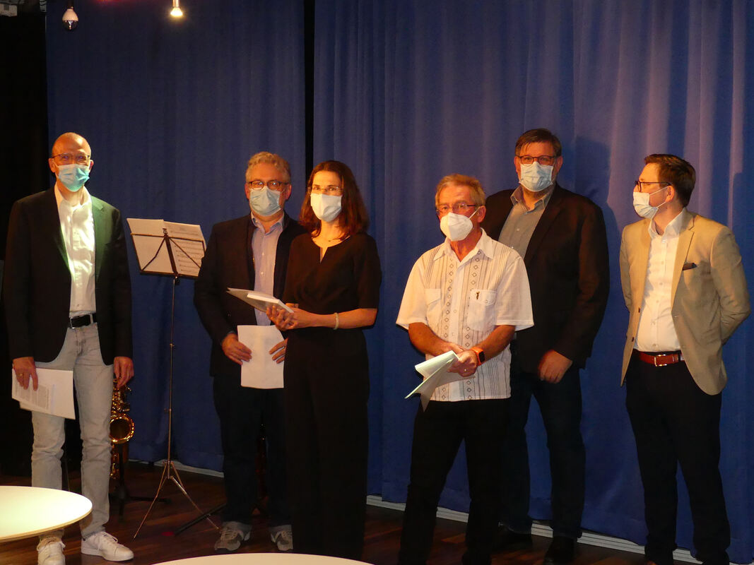 Der zweitplatzierte Autor Wolfgang Wörz (von links), Initiator Walther Stonet, die Siegerin des Kurzgeschichtenwettbewerbs, Dr. Andrea Zech, der drittplatzierte Dr. Martin Sowa, Landrat Dr. Ulrich Fiedler und Sparkassen-Regionaldirektor Oliver Göder bei der Preisverleihung im Metzinger Kulturforum.