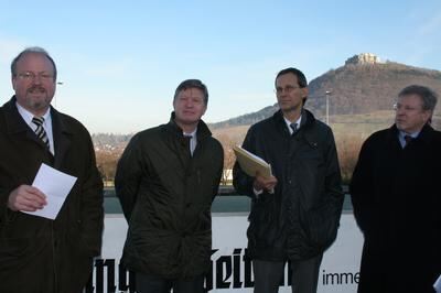 Gruppenbild mit Hohenneuffen: Neuffens Bürgermeister Wolfgang Schmidt, der Esslinger Landrat Heinz Eininger, Wolf Hamann, Leiter der Abteilung Umwelt im Regierungspräsidium und der Tübinger Regierungspräsident Herrmann Strampfer (von links).