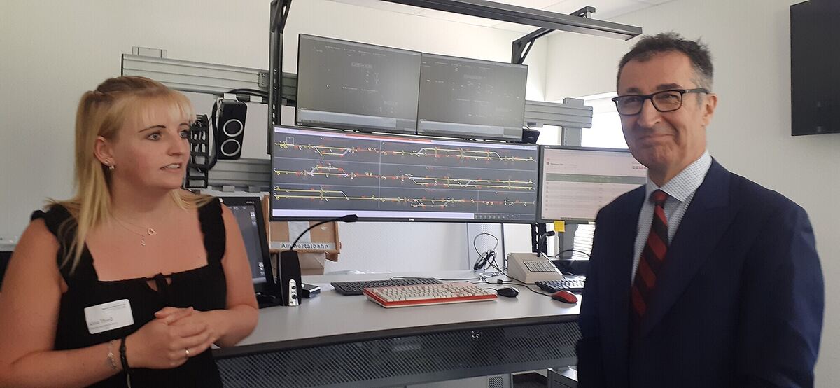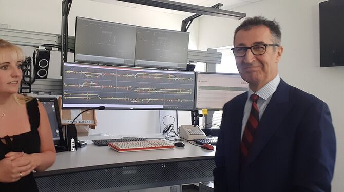Der gebürtige Uracher und heutige Promi-Grüne Cem Özdemir, der schon Anfang der 1980er-Jahre für die Reaktivierung der Ermstalbahn gekämpft hat, lässt sich von Alina Thieß, Betriebsleiterin der RSBNA Erms-Neckar-Bahn Schieneninfrastruktur GmbH, das Stellwerk in Dettingen-Gsaidt erklären.
