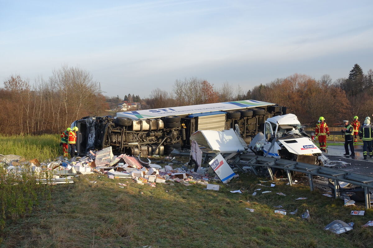 Beim Eintreffen von Feuerwehr und Rettungsdienst war der schwer verletzte 52-jährige Lastwagenfahrer in seinem Führerhaus eingeschlossen, und musste geborgen werden.