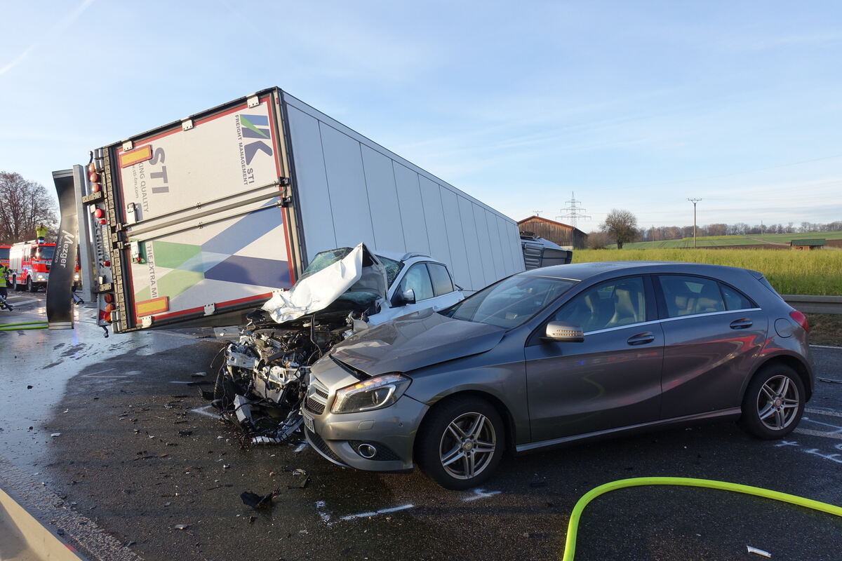 Für den in den Trümmern seines Sprinters eingeklemmten 64-jährigen Fahrer kam jede Hilfe zu spät, er starb noch am Unfallort in seinem Lieferwagen. Die beiden Menschen in den Wagen hinter dem Auflieger wurden verletzt, einer davon schwer.
