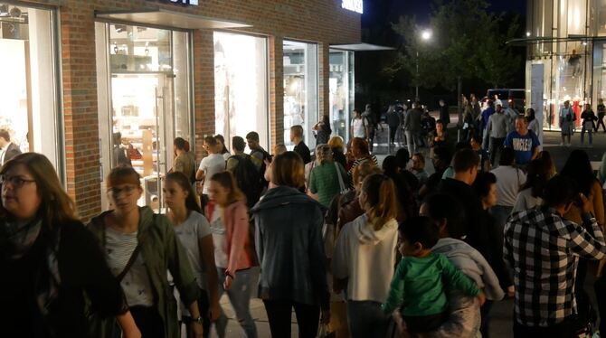 Vor einigen Läden bildeten sich gar lange Schlangen mit geduldig wartenden Gästen. Allerdings drängten sich auch in der Innenstadt die Menschen in der zur Fußgängerzone transformierten Reutlinger Straße, viele saßen im Freien vor den Cafés oder Gaststätten, niemand musste frieren, alle konnten das besondere Ambiente genießen - entweder vor dem farbig angeleuchteten alten Rathaus oder auch in der illuminierten Shopping-Meile. "Eine gelungene Veranstaltung waren sich Meike Hespeler und Jochen Kromer von MMT einig.