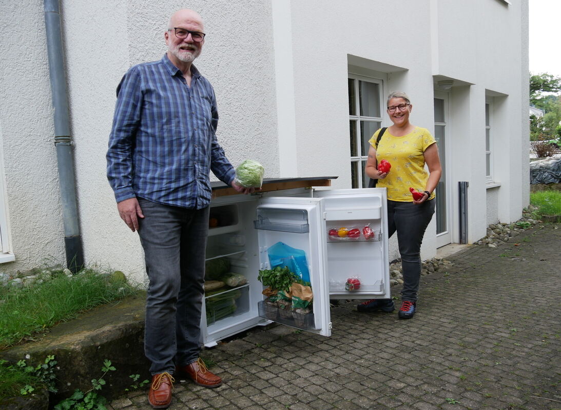 Sylvia van Buijtenen hat die Idee des Foodsharing nach Wannweil gebracht. Hier ist sie zusammen mit Pfarrer Bernd Rexer hinter dem Martin-Luther-Gemeindehaus zu sehen, wo zwei Kühlschränke stehen, in denen gerettete Lebensmittel zum Verteilen angeboten werden.