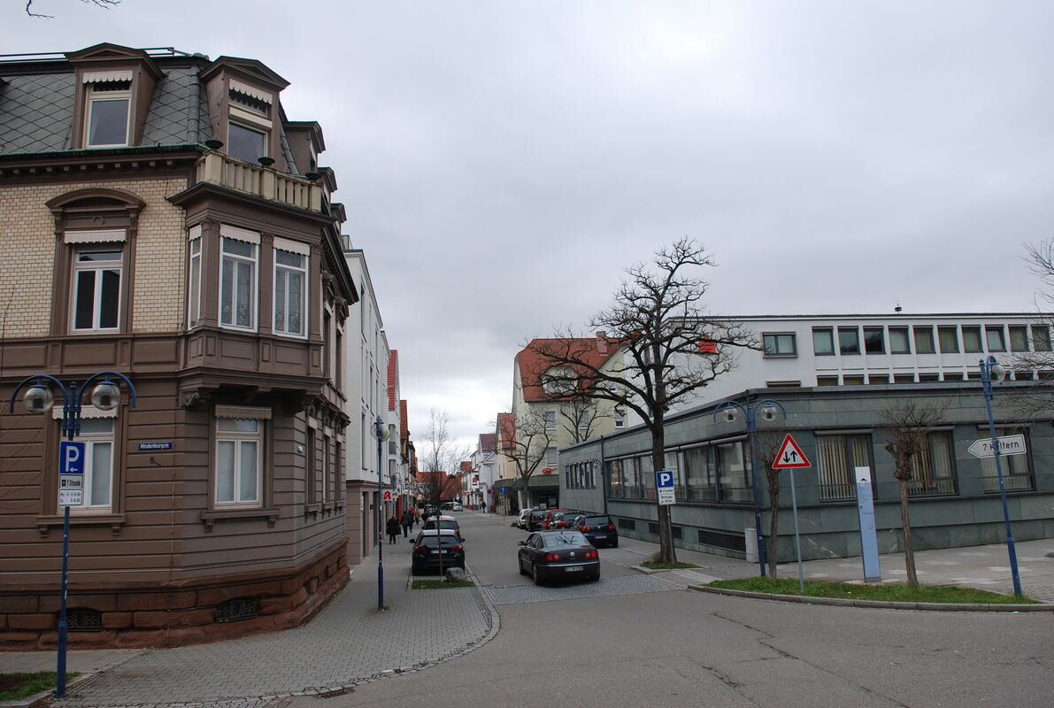 Blick in die Schönbeinstraße: Die denkmalgeschützte Villa Völter (links) und der geplante Neubau der Kreissparkasse anstelle des jetzigen Bankhauses (rechts) sollen künftig das Tor zur Innenstadt bilden. FOTO: PFISTERER
