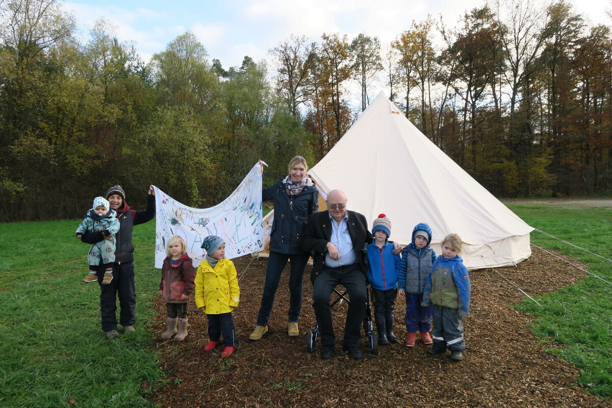 Jürgen Brixner von der gleichnamigen Stiftung besucht den Naturkindergarten und schaut sich das von ihm gespendete Tipizelt an. FOTO: KLEIN