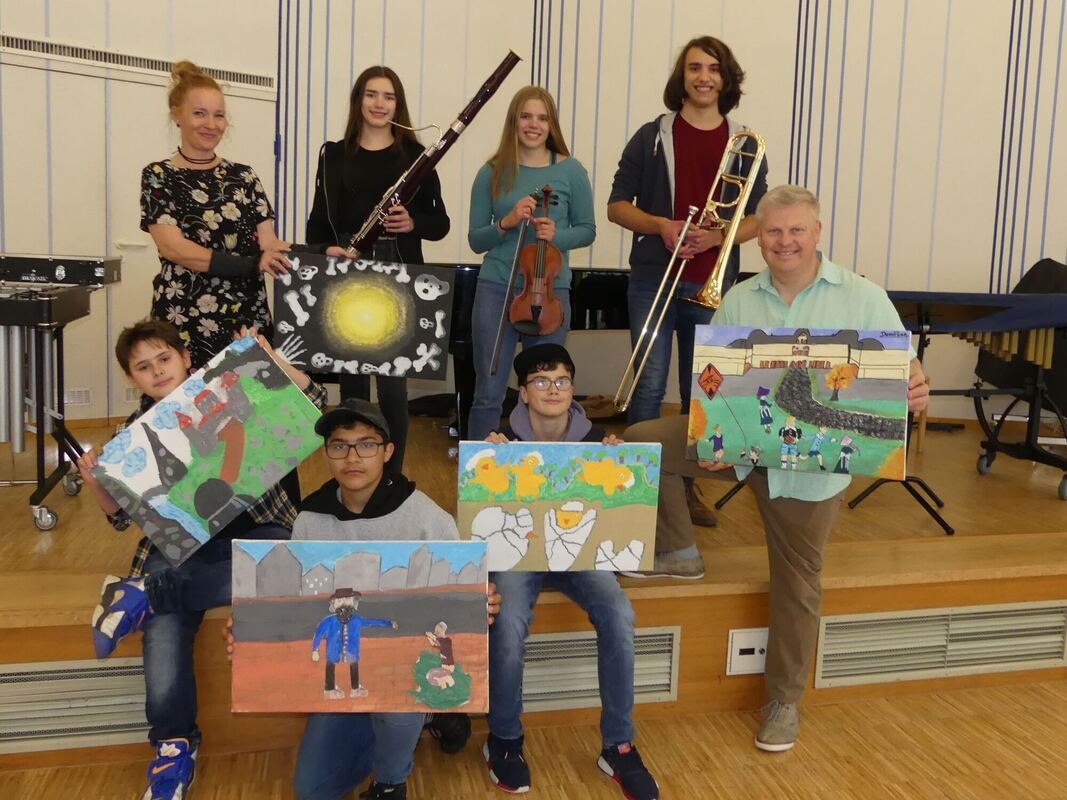 Bilder, die man hören kann und Musik, die man sehen kann, zeigen Schönbein-Realschüler zusammen mit Galeristin Bettina Scharping und Musikschulleiter Bruno Seitz. FOTO: SANDER