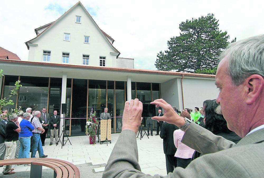 Wolfgang Schütz (rechts), Geschäftsführer von Mythos Schwäbische Alb, fotografiert während der Einweihung des neuen Hauses des Tourismus in Bad Urach. Am Mikrofon spricht der Uracher Bürgermeister Elmar Rebmann. Mythos, der Tourismusverband des Landkreises, wird neben dem Schwäbische Alb Tourismus und dem Schwäbischen Streuobstparadies in die oberen Stockwerke einziehen. FOTO: FINK