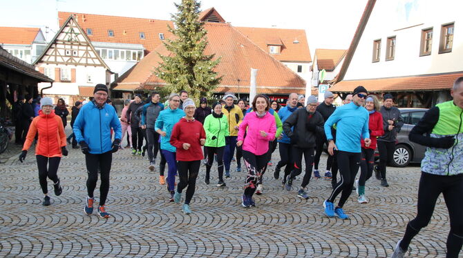 Jetzt laufen sie wieder: Die Teilnehmer am Neujahrslauf beim gemeinsamen Start auf dem Kelternplatz