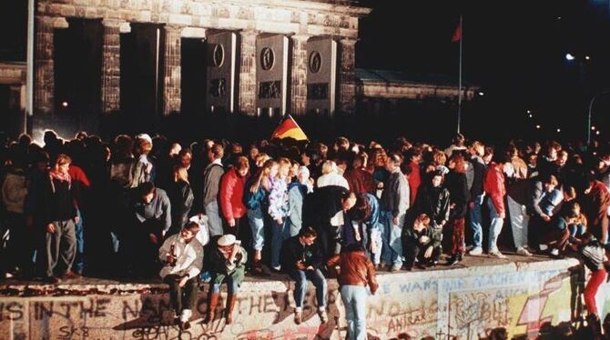Jubelnde Menschen stehen am 9. November 1989 auf der Berliner Mauer vor dem Brandenburger Tor. Foto: dpa